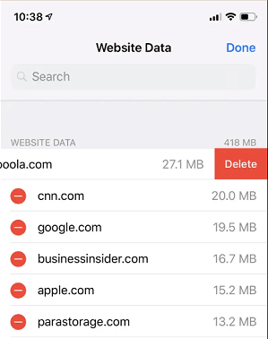 Now that you get to the Website Data page, you can delete an individual site’s data by swiping left and tapping Delete.