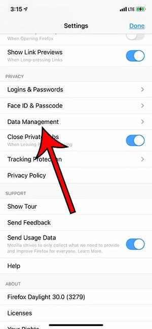 Step 1. Launch Firefox on your iPhone > Toggle the menu icon > Select Settings followed by Data Management.
