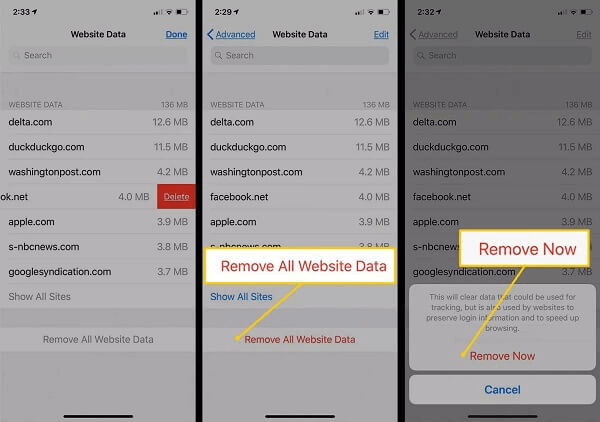 Step 2. Tap Remove All Website Data > In the pop-up menu, tap Remove Now to delete all of your cookies from Safari settings at once.