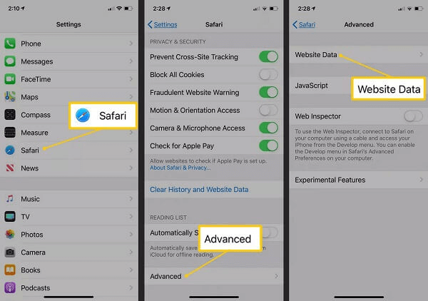 Step 1. Go to the Settings app on your iPhone > Locate and tap Safari > Scroll down to choose Advanced > Select Website Data.