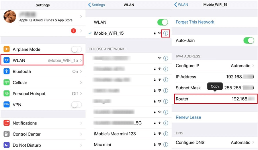 Step 1. Go to the Settings app on your iPhone > Choose WLAN > Tap the Wi-Fi name that you want to find the password > Tap the i icon > Copy the address of the Router.