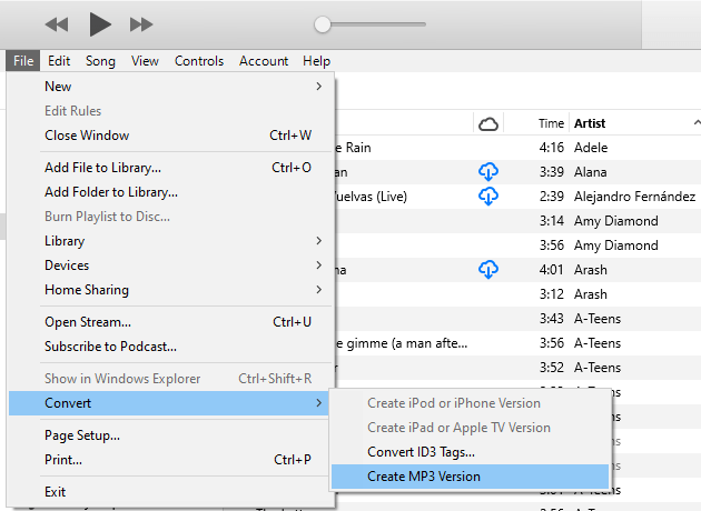4. Next, select the song again and go to the "File" menu > Choose "Convert" > "Create AAC version." (If "Create MP3 version" is the only option available, select it.)