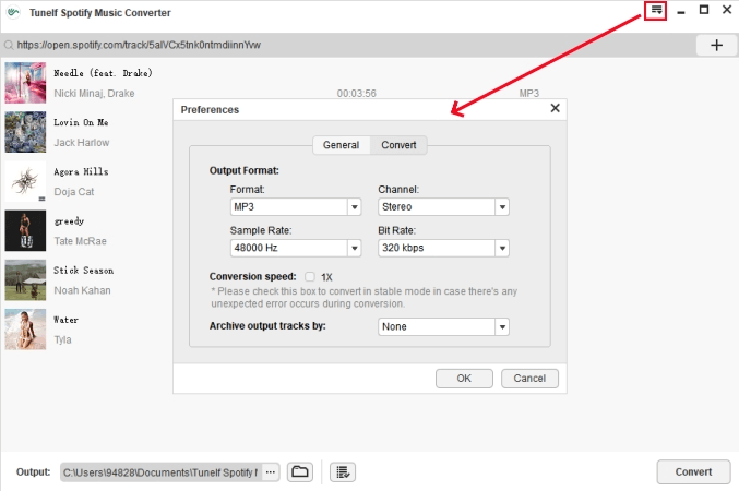 Step 3. Click the menu icon at the top right corner > Go to Preferences > From the pop-up window, set the output audio parameters as per you like > Click OK, and then Convert to begin the task.