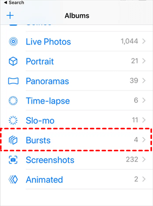 Step 1: Launch the Photos app on your device > Navigate to the Albums tab situated at the bottom of the screen > Scroll down to locate and access the Bursts folder.