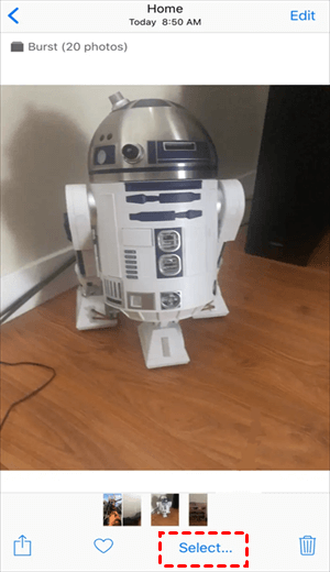 Step 2: Select the specific photo you wish to review, then tap Select… at the screen’s bottom > Swipe through the series for a comprehensive review the burst photos.