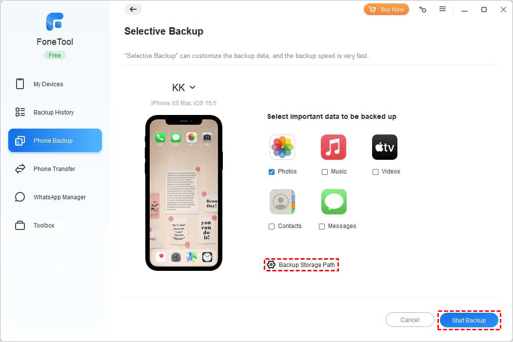 Step 4. Choose a storage path as you like > Click Start Backup to make it.