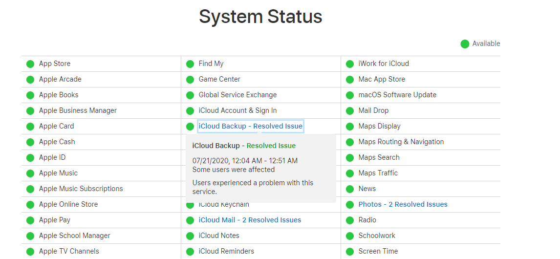 No matter what trouble you encounter on your Apple devices, you can go to the site of Apple’s System Status to check whether everything goes well. Visit the Apple System Status page to check for any ongoing server issues.