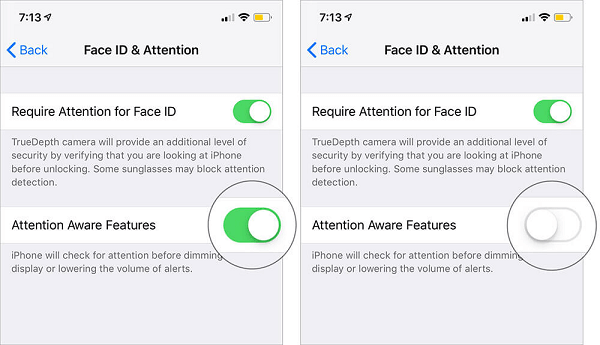 Open Settings app on your iPhone > Go to Face ID & Attention. Slide the Attention Aware Features switch to off (gray).
