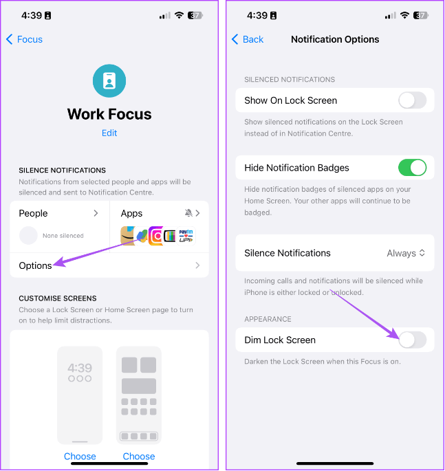 Step 2. Tap Options > Under the Appearance section, make sure the Dim Lock Screen is toggled off.