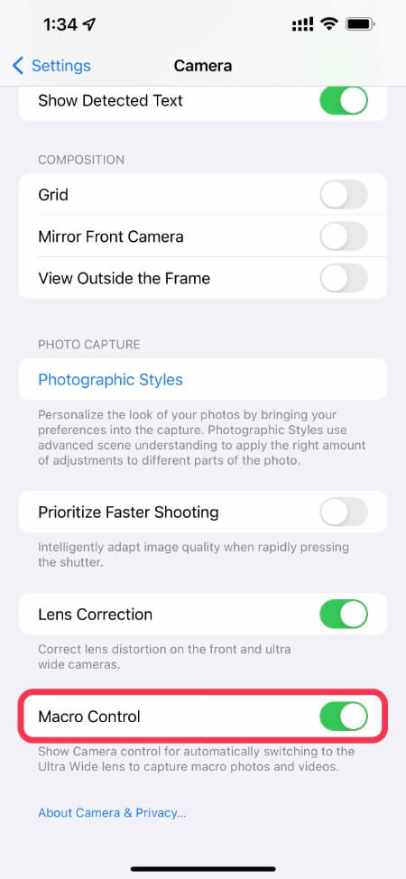To fix this issue, try turning off auto macro mode. Open Settings > Tap Camera > Tap Macro Control and turn it off > Return to the camera app to see if this has fixed the blinking.