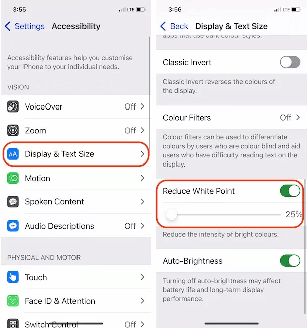 If your iPhone screen appears dim and you suspect that the "Reduce White Point" accessibility feature might be affecting it, you can turn off this feature to see if it resolves the issue. "Reduce White Point" reduces the intensity of bright colors and can make the screen appear dimmer. Here's how to turn it off: