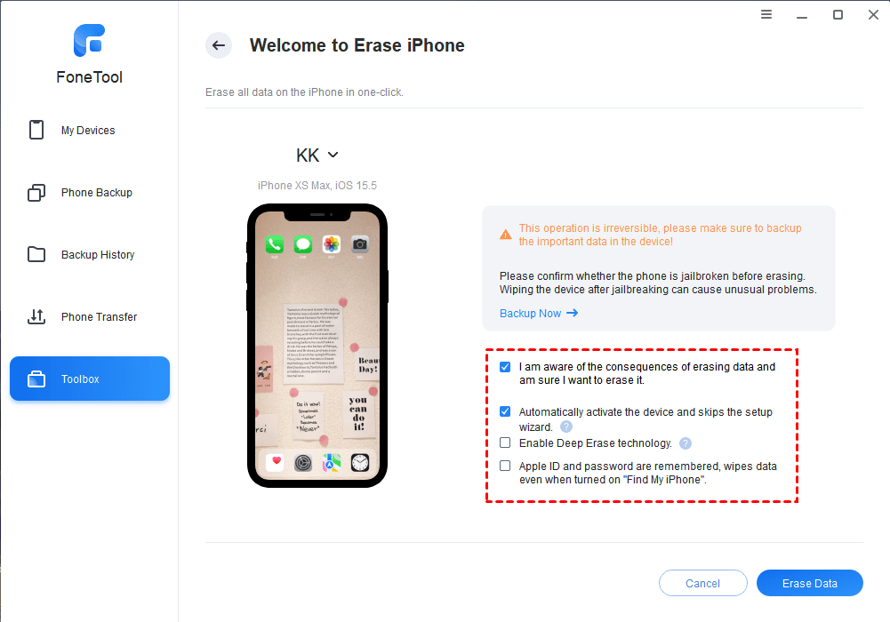 With this app, you can fully or selectively back up your iPhone data at a super-fast transfer speed. Except for erasing all data on iPhone, FoneTool can also help you erase private data such as photos, videos, Safari history, Podcasts and more. With the deep erase technology, your data can be wiped permanently and can’t be recovered anymore.