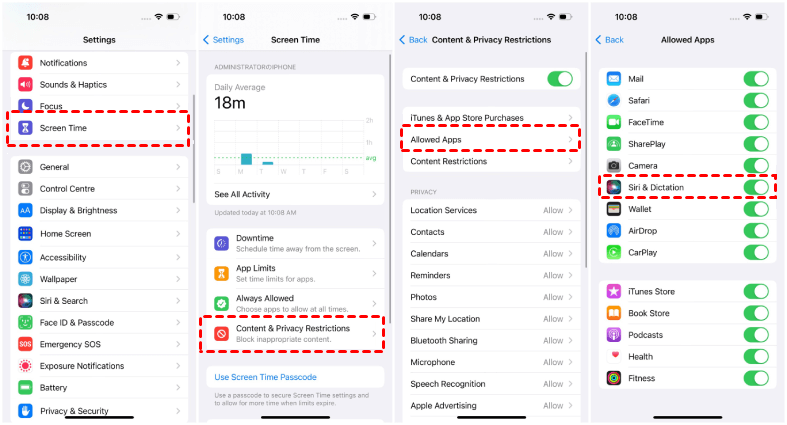 Step 2: Select Allowed Apps > Turn off the toggle next to the Siri & Dictation option.