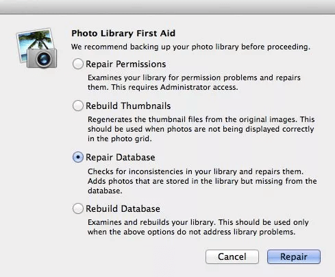 Step 3. Press Command + Option keys until you see Photo Library First Aid window as below. For iPhoto version 9.2 and earlier, the interface will look different but almost the same.