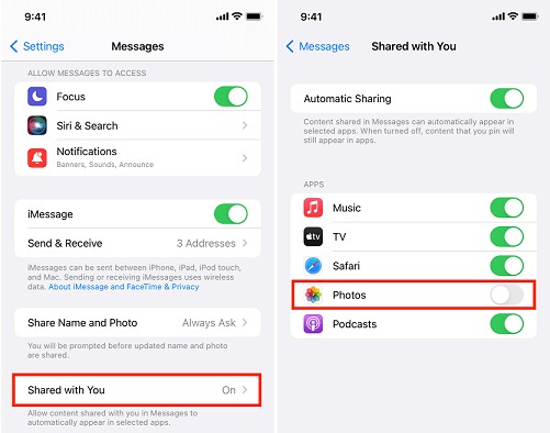 Step 2. Go to Shared with You > Make sure the Photos is enabled, which allows you to saving photos to your iPhone.