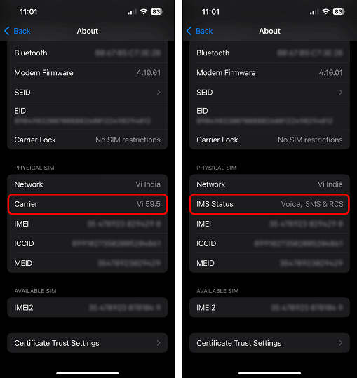 Step 2. Scroll down and double-tap Carrier > Check whether the IMS Status says Voice, SMS & RCS.