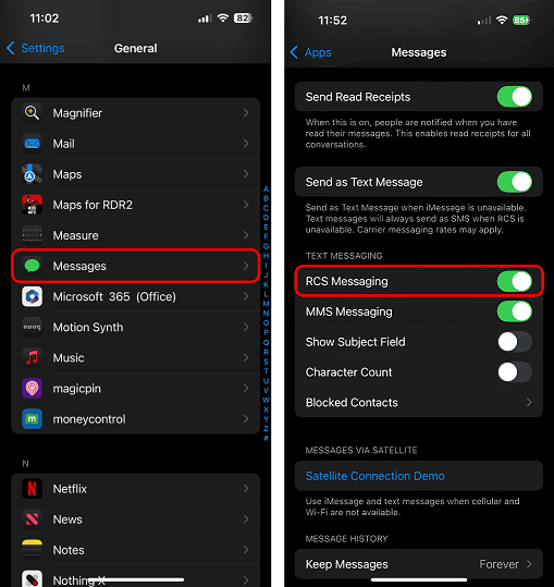 As what has been mentioned above, if your carrier supports RCS, you can use RCS as long as you turn it on in the Settings app. Thus, when RCS not working iOS 18/26, you meed to check whether you’ve enabled it.