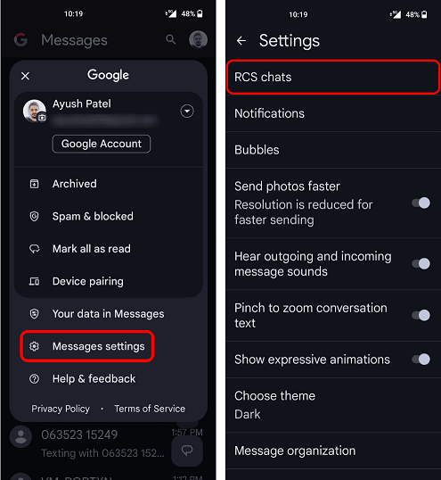 Step 1. Go to the Messages app on the Android phone > Tap the profile picture in the top-right corner > Choose Messages Settings > Tap RCS Chats.