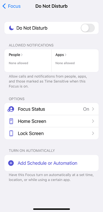>> From iPhone Settings: Open Settings on your iPhone > Scroll down to locate and tap Focus > Do Not Disturb > Toggle off the switch next to Do Not Disturb.