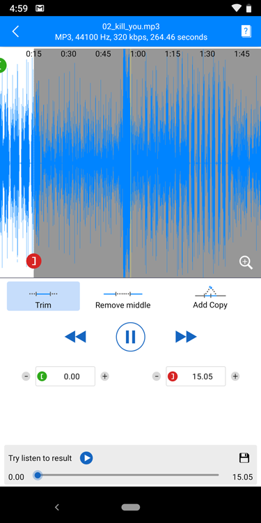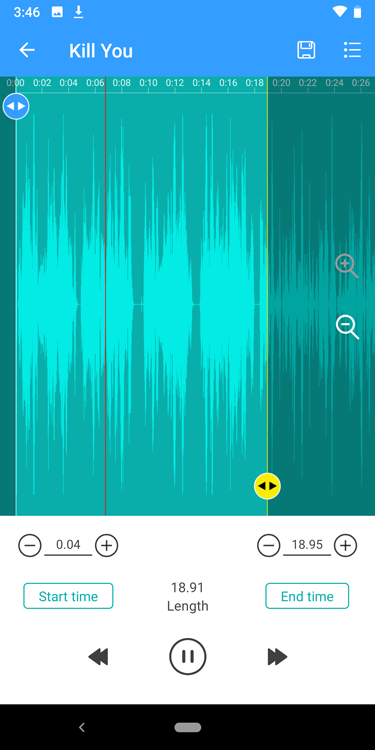 This app offers a functional UI with features like themes, file explorer, recorder, and waveform editor. It's completely free and ad-supported, with non-intrusive ads. You can set start and end times manually or scroll and zoom in the editor mode. It supports popular music formats.