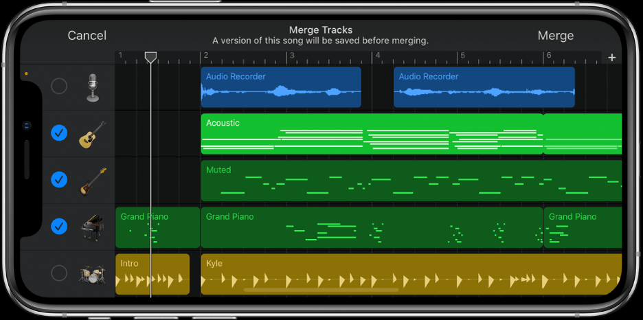 Step 1. Download, install, and launch GarageBand on your iPhone > Tap a track header to select it, tap it again > Tap Merge.