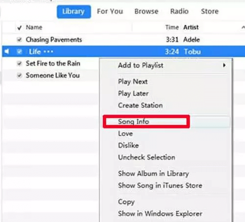 Step 1. Upon launching iTunes, transfer your desired songs to the iTunes library. Click on the song you wish to transfer, then select "Song Info."