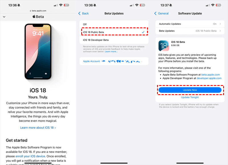 If you decide to install the iOS 26 beta, here is how to update iOS without computer. After completing your phone backup, the next step is to download the iOS 26 public beta. Here's a breakdown of what you should do: