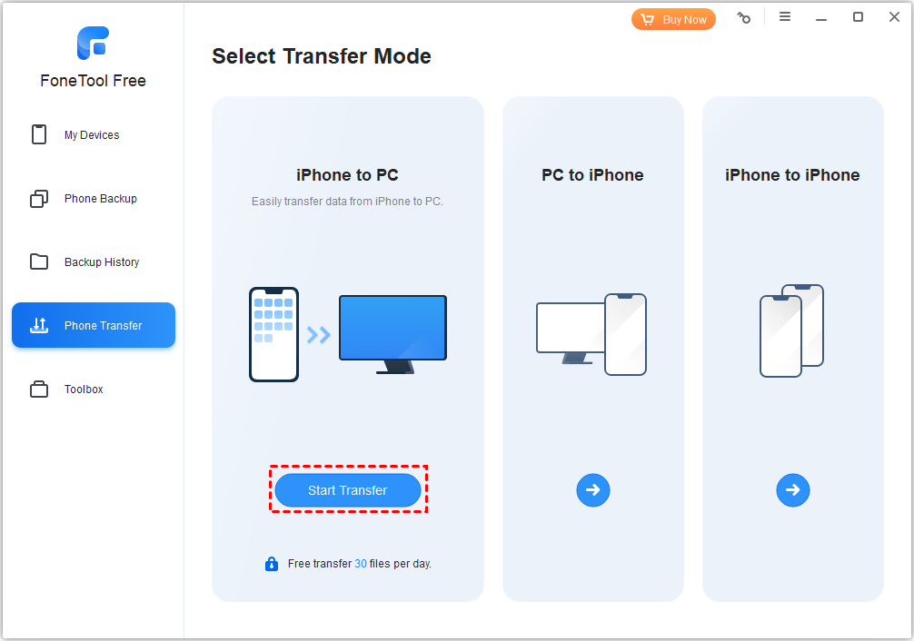 Step 1: Open FoneTool on your PC > Locate the Phone Transfer option on the toolbar, select iPhone to PC, and then click Start Transfer.
