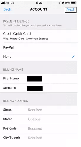 Step 4. Select the mode of payment to None > Fill out the U.S Billing Address, and contact information and click Next to proceed. In your new ID, don’t add your credit card information.