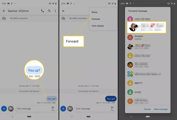 Step 2. Select these text messages > Tap Forward, which may appear as an arrow > Choose your email account from the list. If there isn’t, choose New message and enter your email account detail.