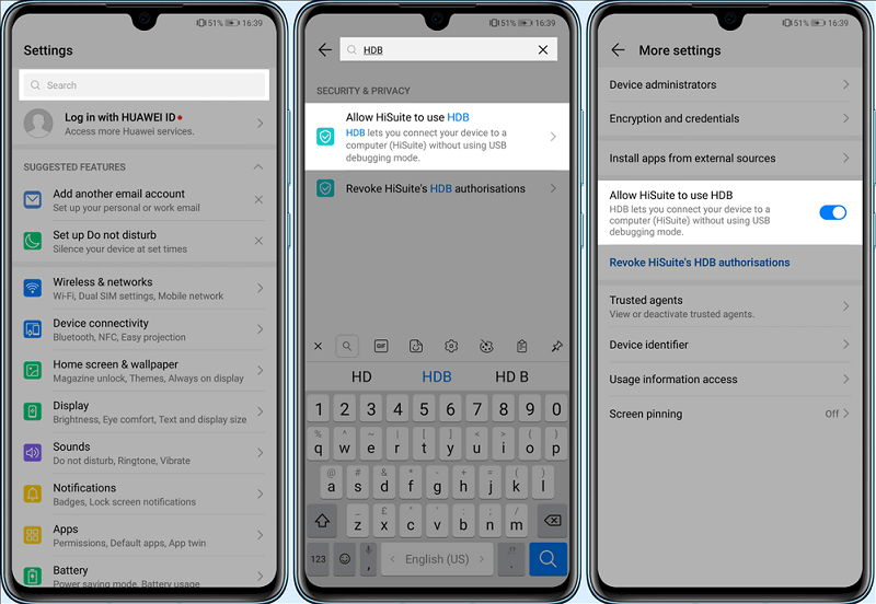 Step 2. On your Huawei phone, go to Settings > Type HDB in the search box > Choose Allow HiSuite to use HDB.
