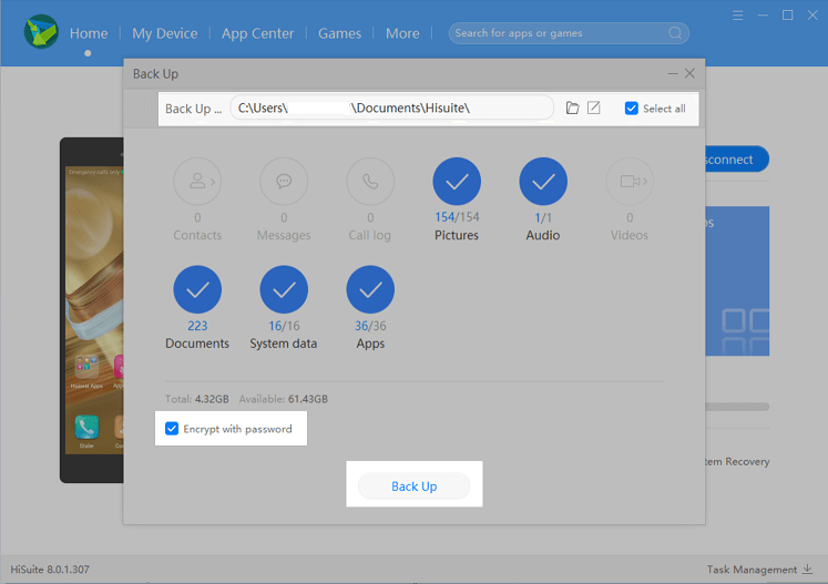 Step 3. Launch Huawei Hisuite on your PC > Press Back Up > Select Messages and other file types you’d like to save to computer.