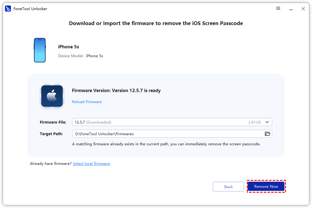 Step 5. Wait for a while, the firmware files will be downloaded. Now you can click Remove Now to start the unlocking operation.