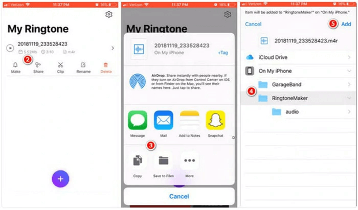 Step 3. On My Ringtone window, tap Share button > From the prompt window, tap Save to Files.