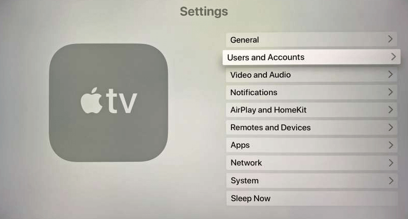 Step 1. Power on your Apple TV and ensure it's connected to the internet > Navigate to the Settings app and select Users and Accounts.