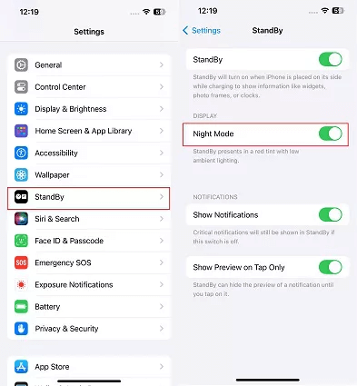 For people who wander to know: " How do I stop StandBy mode from turning red?" You can keep on reading to get answers. Go to the Settings app on iPhone > Choose StandBy. On the next page, under Display, you can see Night Mode. Toggle it off.
