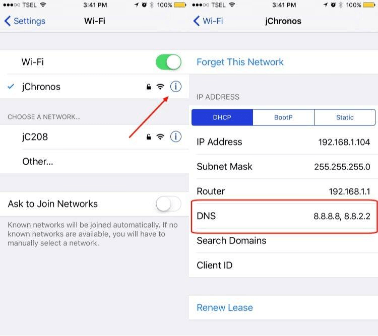 Open the Settings app > Wi-Fi > Tap on the small "i" icon next to the name of your Wi-Fi connection > Click on Configure DNS option > Choose the Manual option > Select Add Server and type in 8.8.8.8 as the New DNS Server > Tap on Save to make it.