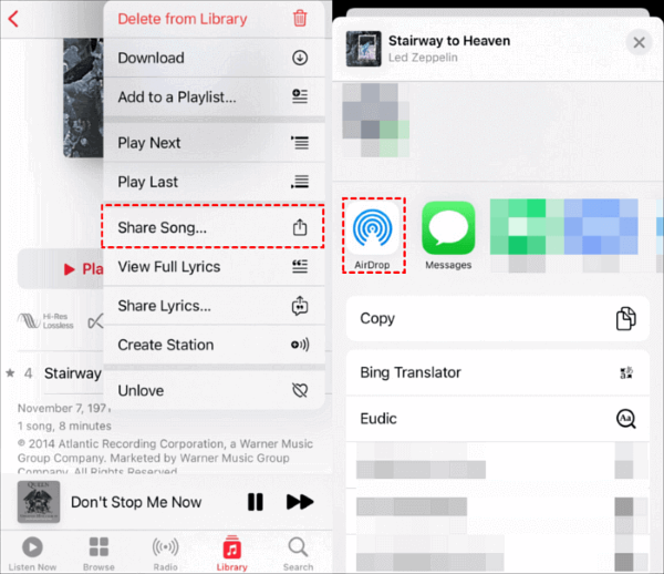 - AirDrop from Apple Music: Find the song/album in the Music app, tap the three dots (⋯), and select Share Song, tap AirDrop, and select the target iPhone name.