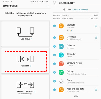 Step 2: On your old Android device, select Send Data > Select Wireless from the Connections screen on your old phone and click Allow to authorize.