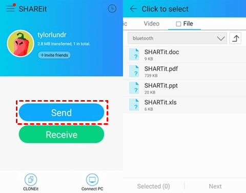 Step 1: Download and launch Shareit on the source Android device > Tap Send and select the file you want to transfer.