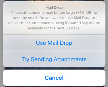 Step 3. A message will appear and say that the video is too large to send and it will suggest you use Mail Drop > Simply tap Mail Drop and it will start the transfer.