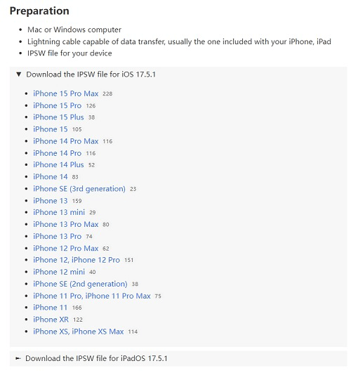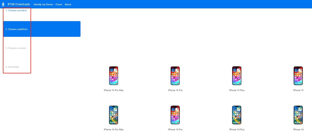 Step 2: Navigate to the IPSW website, select your iPhone model, and download the desired version of iOS.