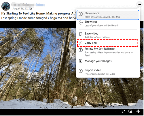 Step 1. Locate the video you wish to save > Click the More icon (three horizontal dots) in the top right corner of the video post > Select Copy Link.