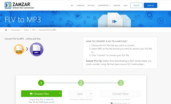 Zamzar is an all-in-one FLV to MP3 converter online, completely free of charge. This tool allows you to convert an unlimited number of FLV videos, with a file size limit of 50MB per session, unless you have a registered account. In addition to locally stored Flash videos, Zamzar allows videos to be imported from direct URLs or a variety of cloud services such as Google Drive, Box, OneDrive, and Dropbox.