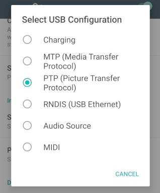 Step 2. Return to the Settings main page and access System > Locate and click Developer Options > Select USB configuration and switch it to Picture Transfer Protocol (PTP).