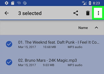 Step 2. Open the Music Folder or where your music file is stored. Select the songs you want to move then tap the vertical ellipsis on the upper right-hand corner.