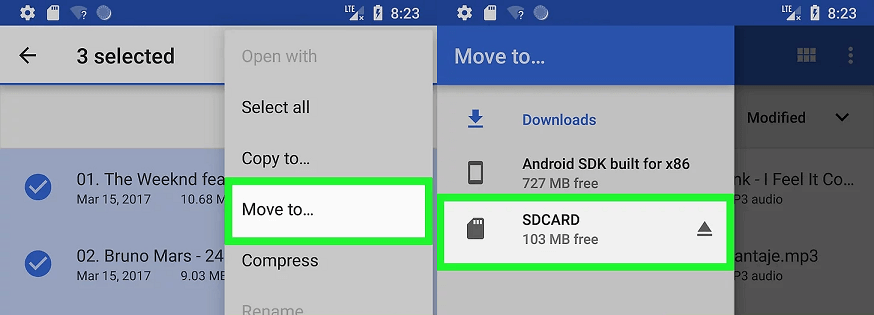 Step 3. Select Move to… > SD Card > Go to folders where you want to save your music files and click Done to move music files from phone memory to SD card.