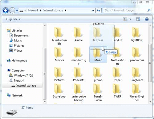 Step 4. Click the Music folder and select your wanted music files > Drag and drop the music from your Android phone to the memory card.