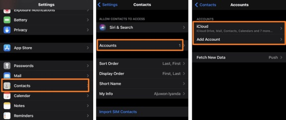 Step 1. Go to Settings > Scroll down a little to locate Contacts > Choose Accounts, and tap Add Accounts.