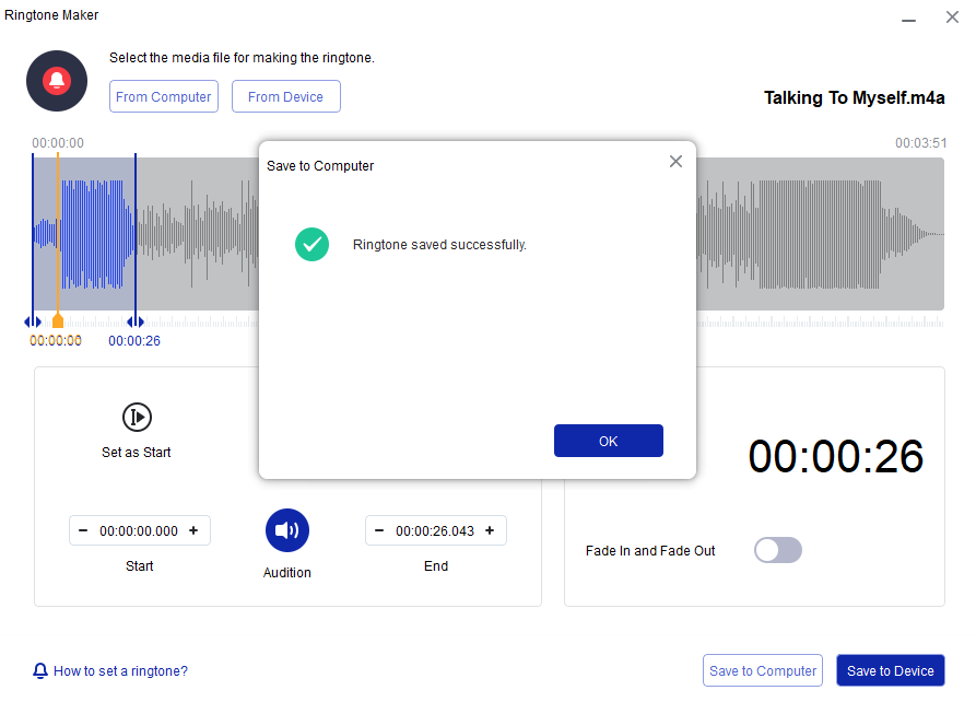 Step 4. After completing the creation, next you should save the ringtone > You can choose either Save to Computer or Save to Device (Connect your devices to the computer).